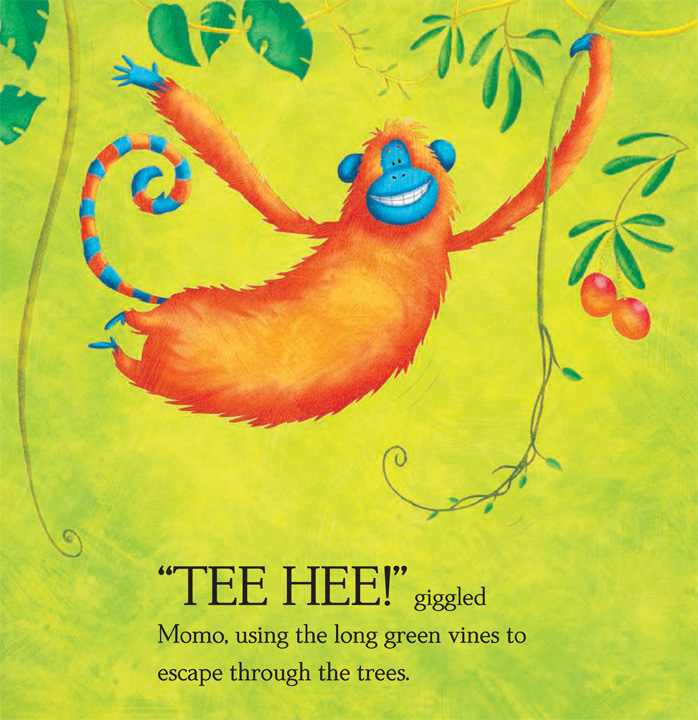 Momo the cheeky monkey is up to his usual tricks again, swinging through the jungle canopy dropping fruit onto the heads of unsuspecting animals below. "Ouch!" say the animals. "Tee hee!" says Momo. But little does he know, that the joke will soon be on him!
